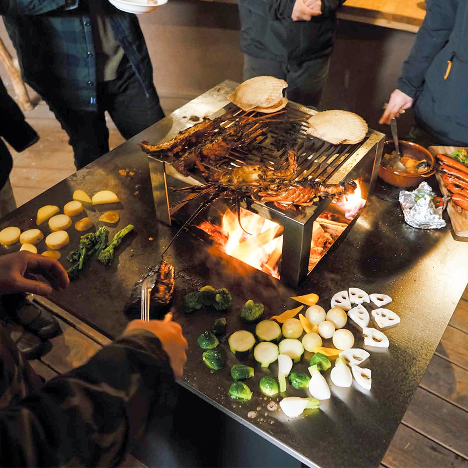 そして焚き火ならではの調理といえば、直火焼き。専用グリルをまんなかに置いて、新鮮な魚介を並べれば、一気に浜焼き気分。